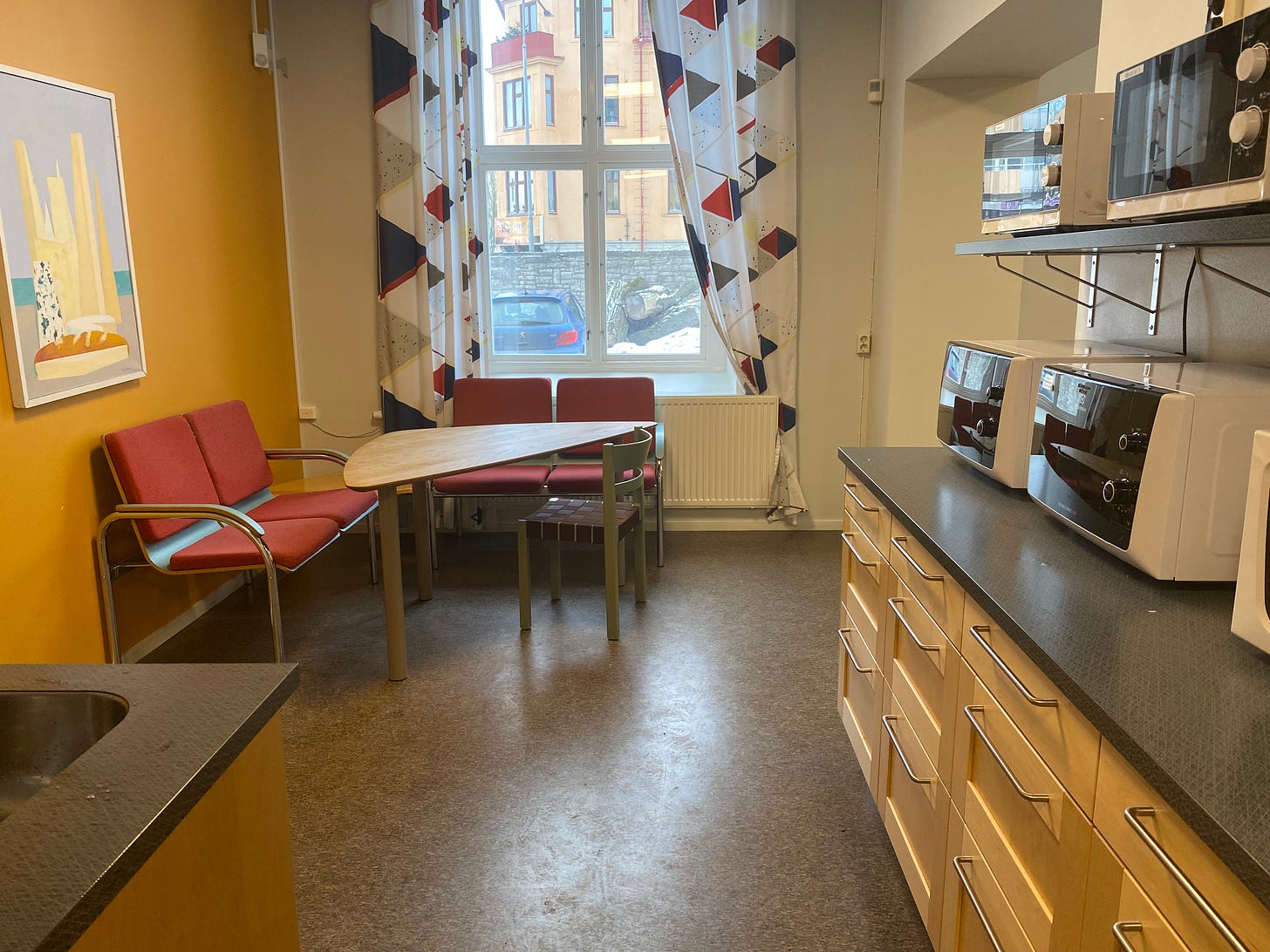 Believe it or not this is a small section of a ‘kitchen’ to be used by students at a university. Notice the microwaves and a classic yet unique seating style.