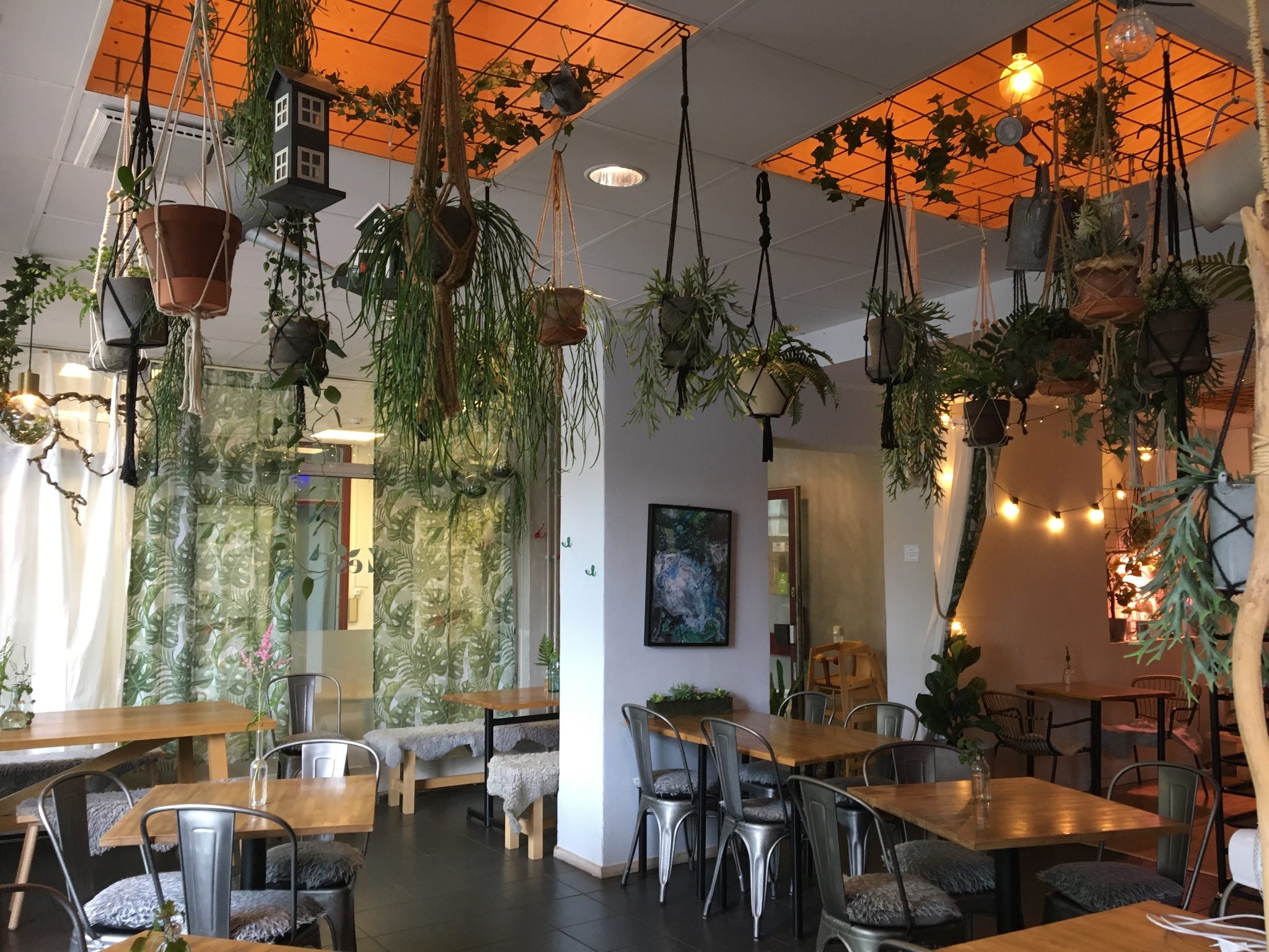 Here is a picture of a vegetarian restaurant. Notice how beautifully plants have been incorporated without taking space or interfering with the seating arrangement, in this small restaurant. Creates a unique design. Even though the restaurant is really small, this special attention to aesthetics of a place, makes it inviting for the customers.